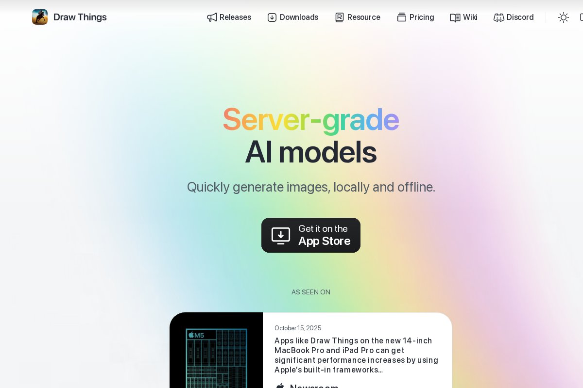 Free AI art generator optimized for iPhone, iPad, and Mac ## About Draw Things Free AI art generator optimized for iPhone, iPad, and Mac. Draw Things works 100% offline, is completely free to use, runs on CPU without a dedicated GPU. ### Platform Support ...