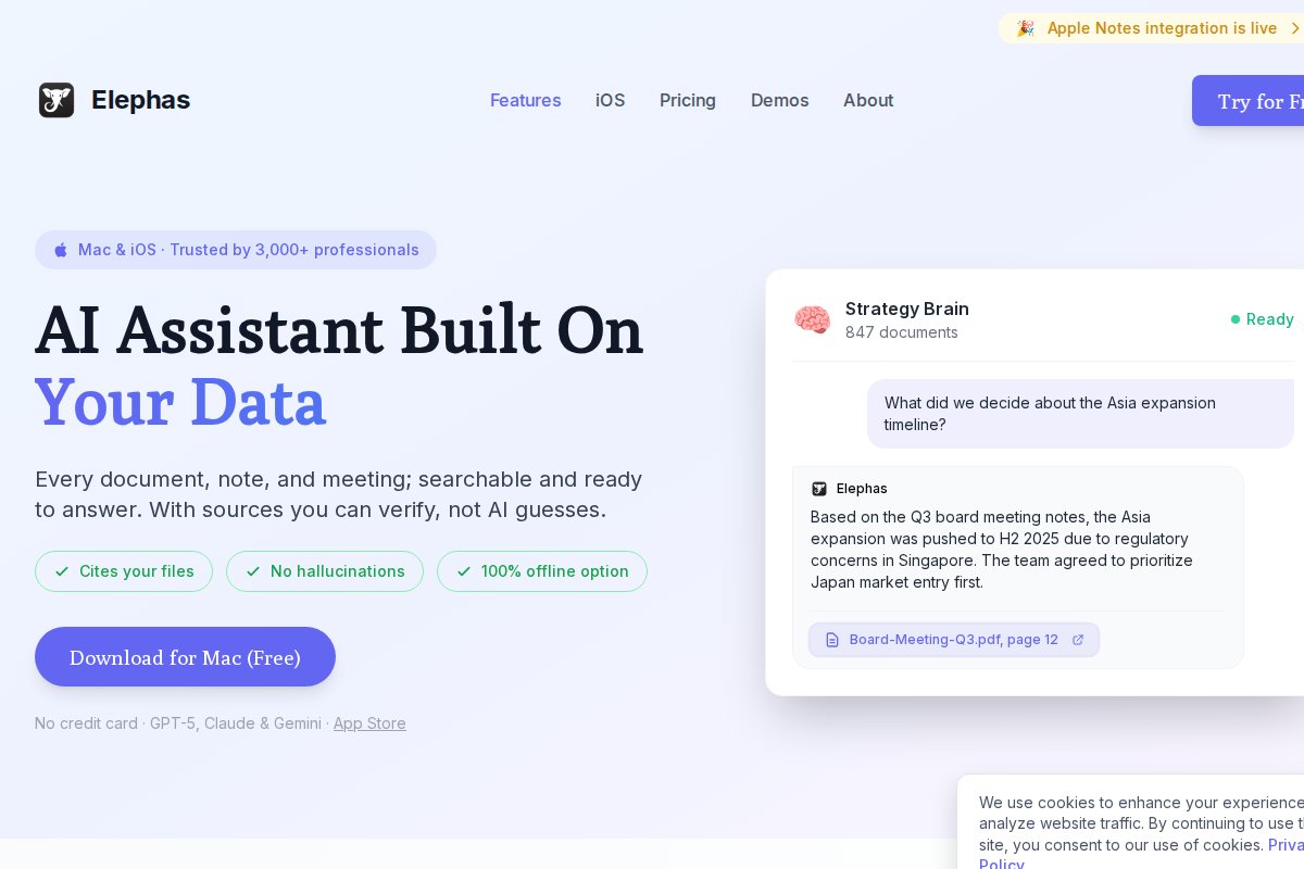 Personal AI assistant for Mac with local knowledge bases ## About Elephas Personal AI assistant for Mac with local knowledge bases. Elephas works 100% offline, runs on CPU without a dedicated GPU. ### Platform Support Available for: **macOS** ### Syste...