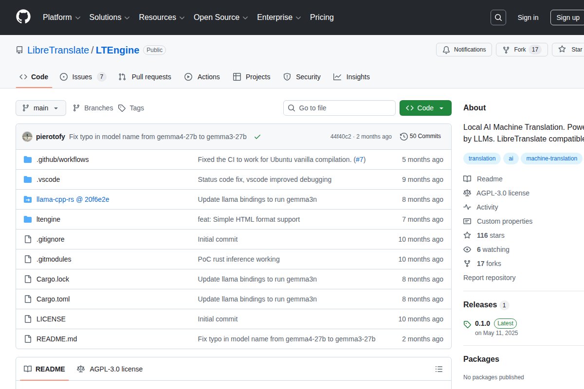 LLM-powered translation engine compatible with LibreTranslate ## About LTEngine LLM-powered translation engine compatible with LibreTranslate. LTEngine works 100% offline, is open source, is completely free to use, runs on CPU without a dedicated GPU. ### Pla...